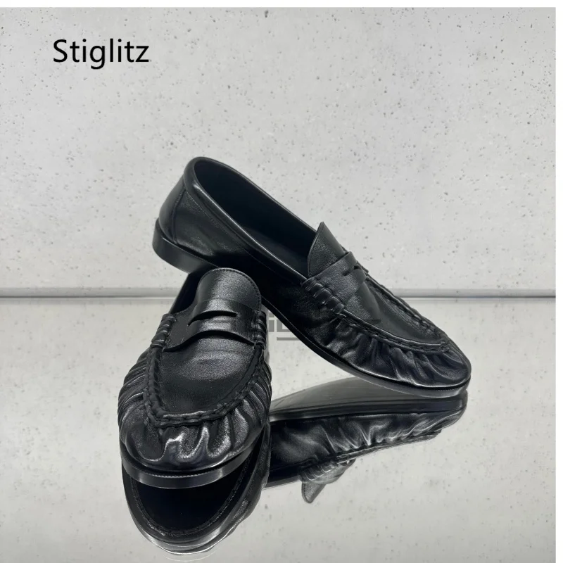 Black Retro Pleated Loafers for Men and Women Slip On Lazy Shoes Pointed-Toe Casual Soft Leather Shoes Comfortable Couple Shoes