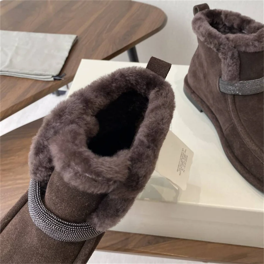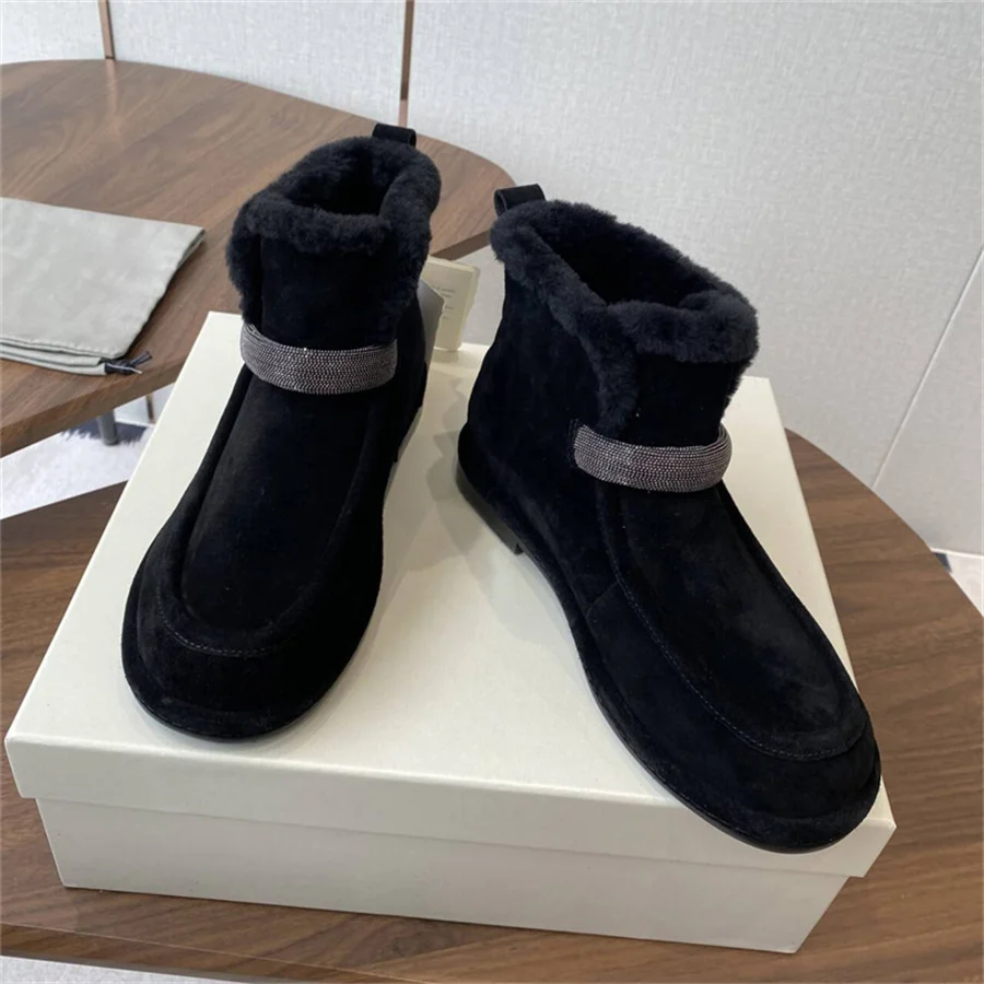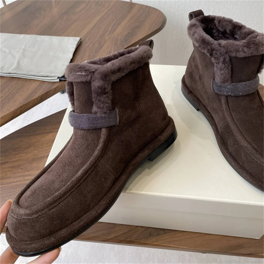 High Quality Winter Suede Leather Inside Fur Flats Heels Ankle Boots Slip On Round Toe Casual Snow Boots Winter Warm Shoes