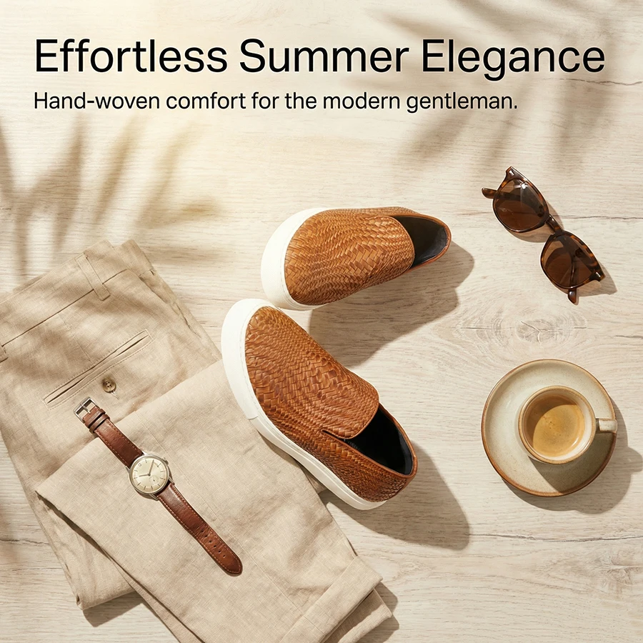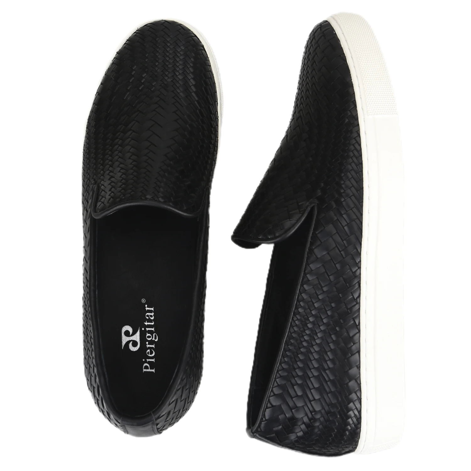 Piergitar Handmade Waxed Woven Leather Slip-On Sneakers For Leisure And Daily Wear Height Increase White Thick Soled Men’s Shoes