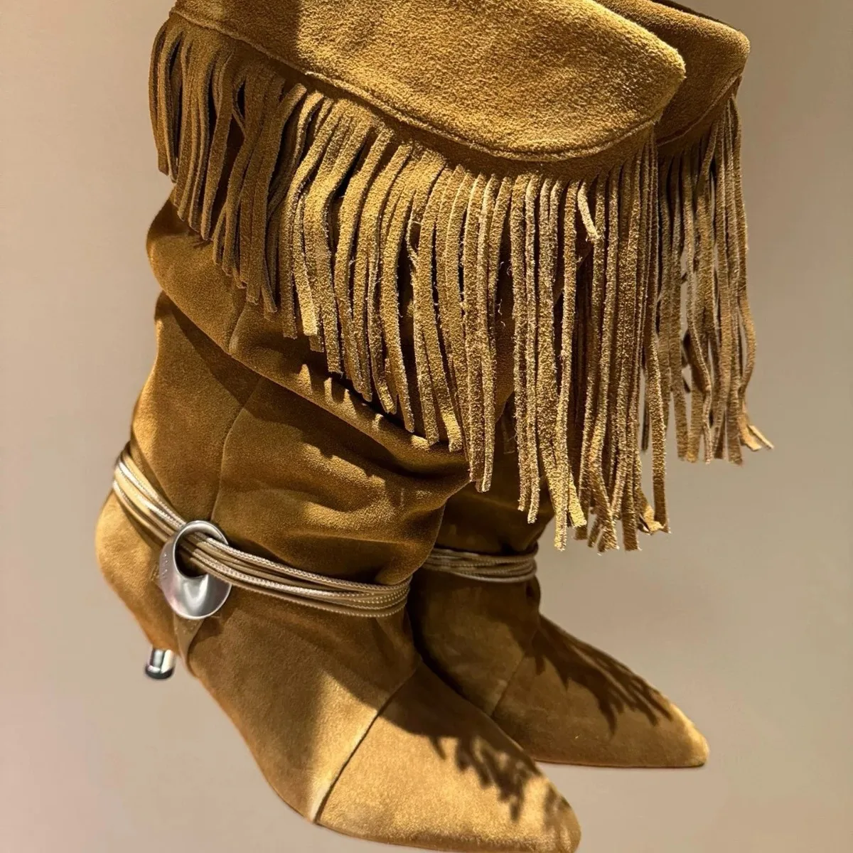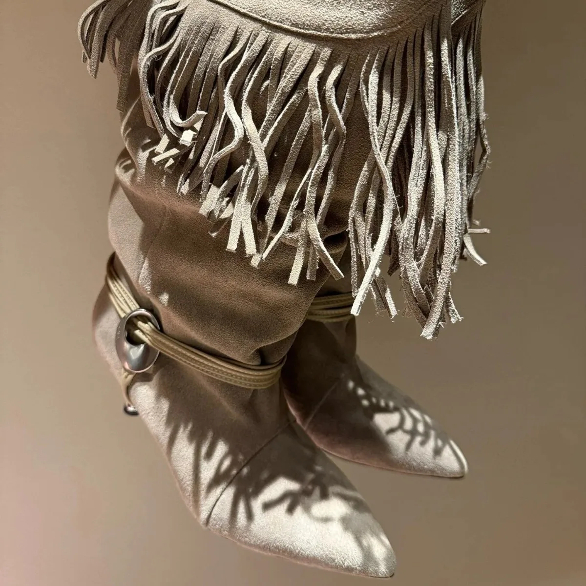 Tassel Cowboy Boots Soft Leather Botas Mujer Point Toe Leather Bottes Femmes Round Pendant Bota Feminina Design Mid Calf Botines