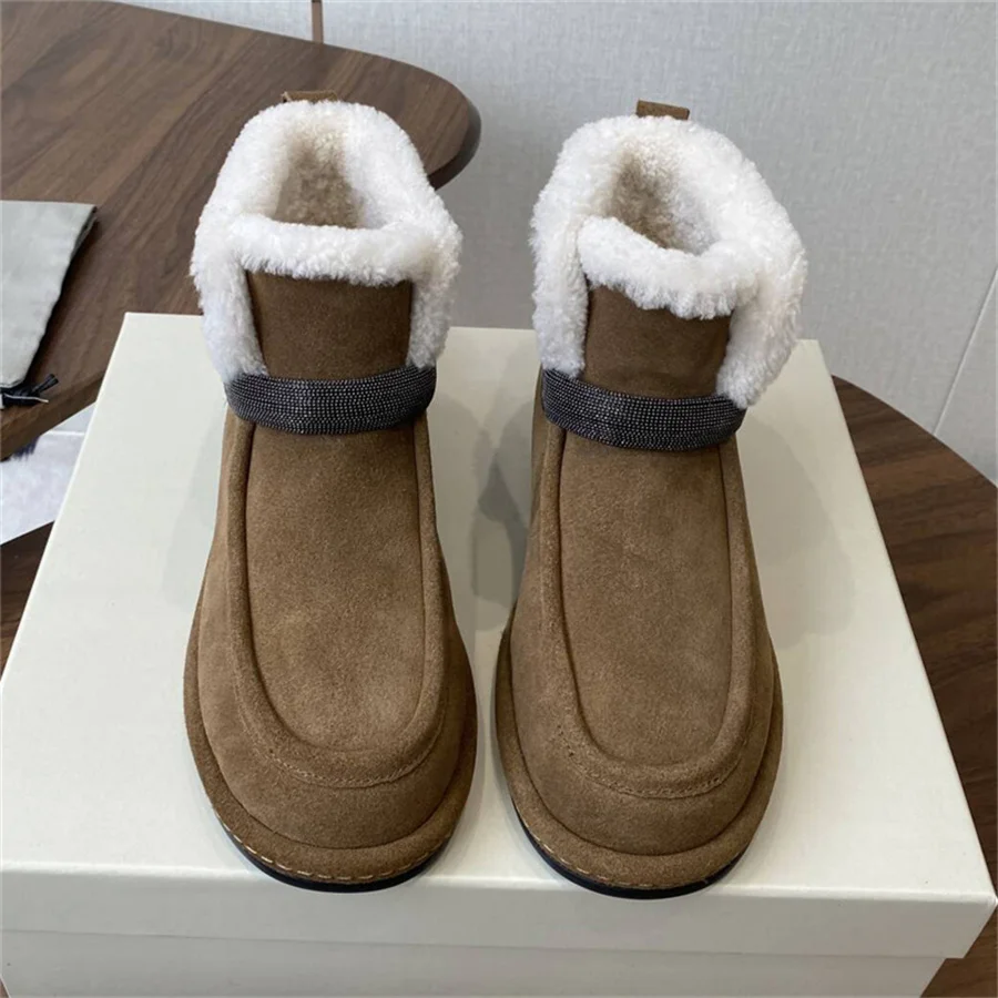 High Quality Winter Suede Leather Inside Fur Flats Heels Ankle Boots Slip On Round Toe Casual Snow Boots Winter Warm Shoes