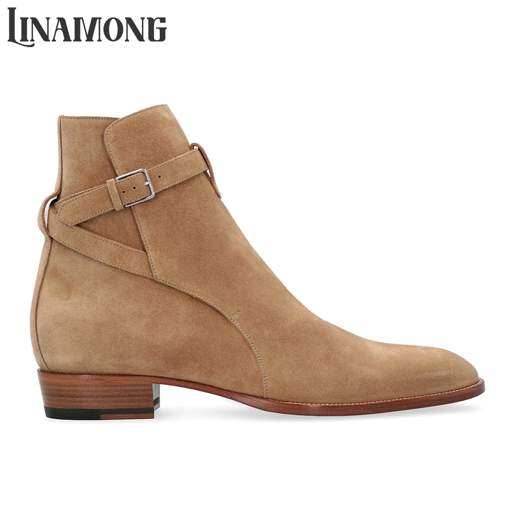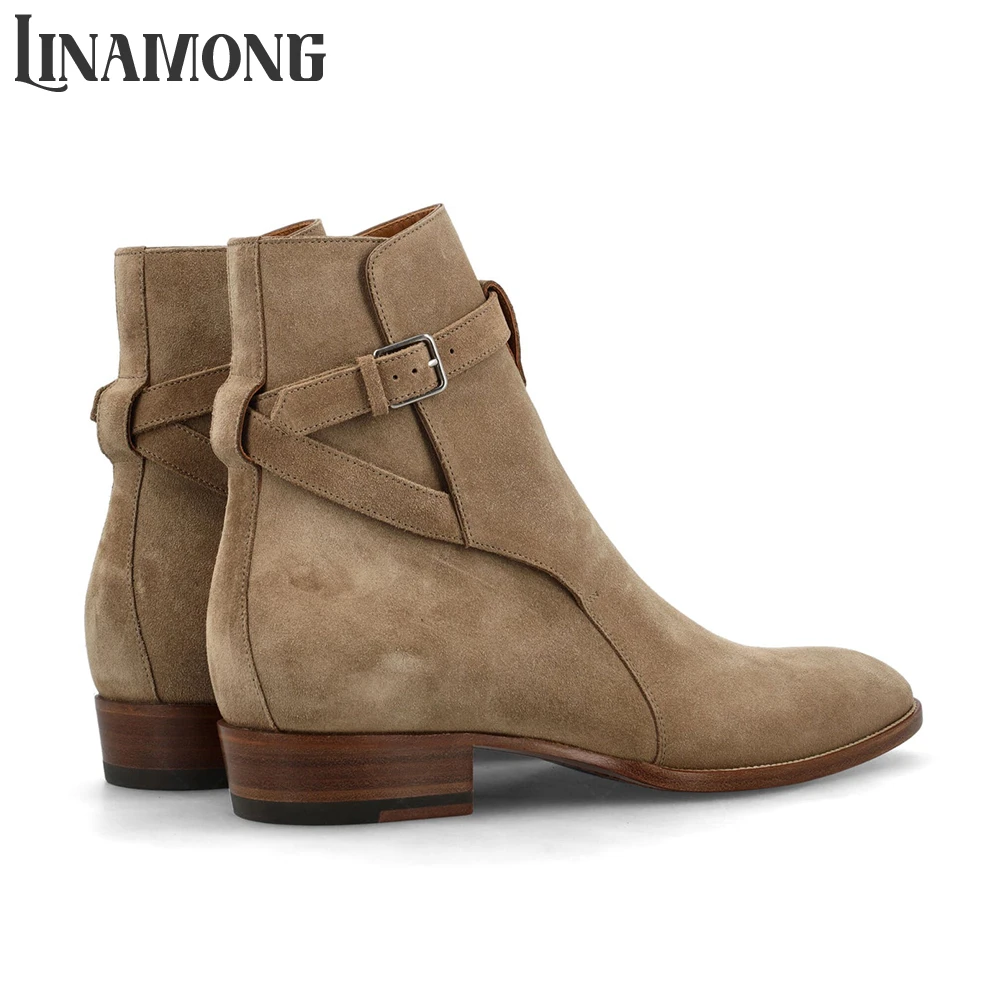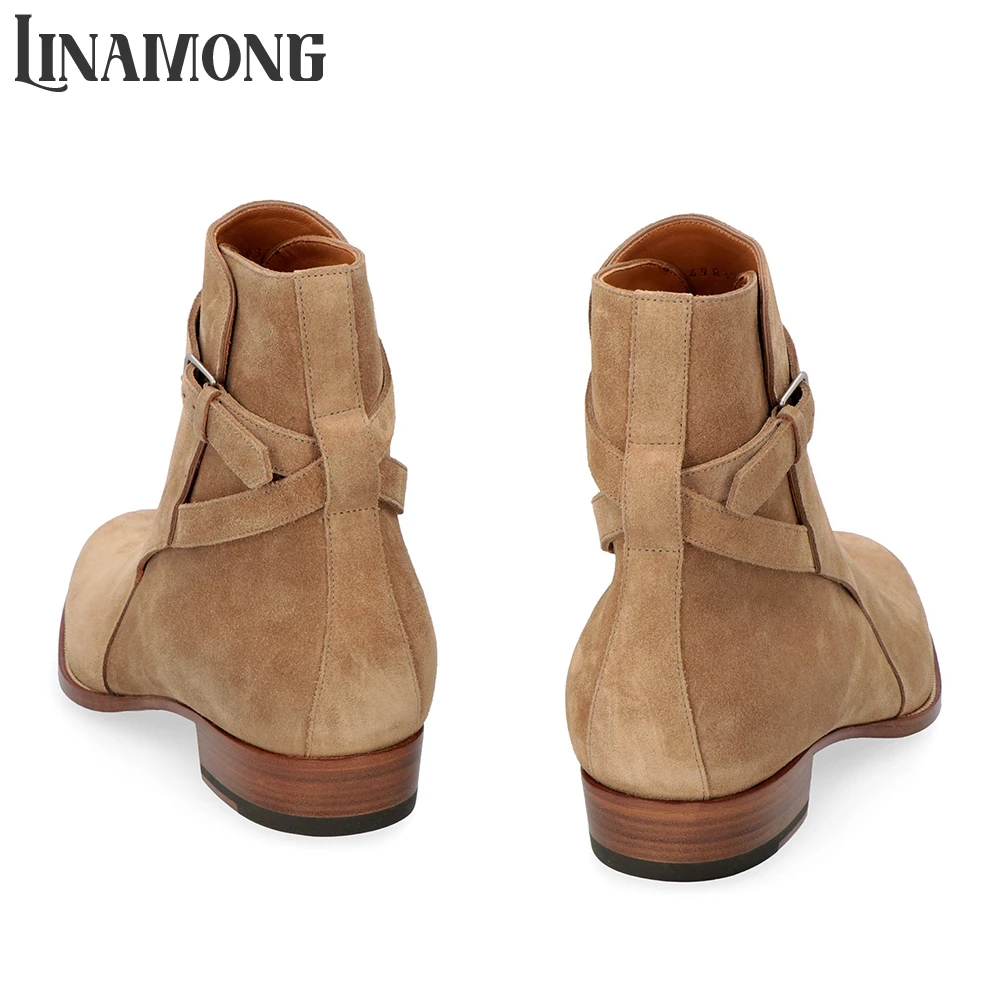 Suede Leather Boots Rivet Cross Strap Buckle Chelsea Boots Round Pointed Toe Side Buckle Retro British Style Ankle Strap Boots